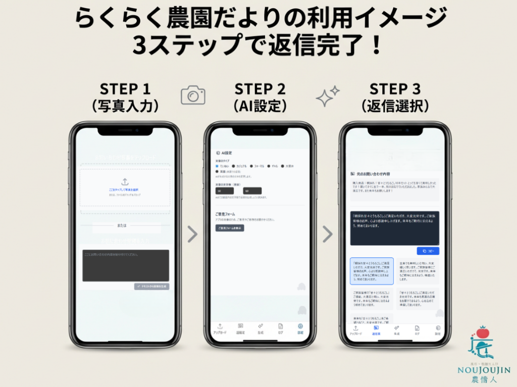 AIは画像内のテキストを読み取り、事前に学習させた「その農家特有の語り口や価値観」を反映した返信案を複数生成します 。農家はそれらを選択・微修正して送信するだけです。