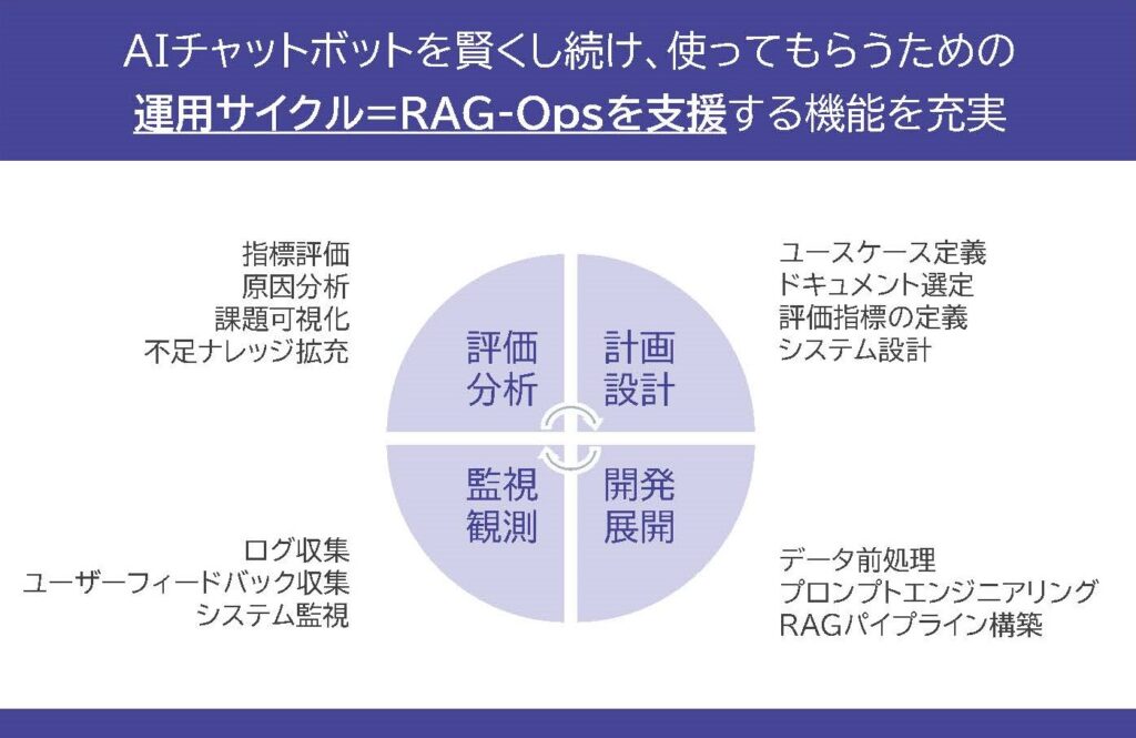 そこで『Omi!Chat』が設計思想として採用しているのが、近年AI運用の要として注目される「RAG-Ops(ラグ・オプス)」という概念です。AIチャットボットを導入するだけでなく、それを「育てやすく、管理しやすい」ための機能を充実させました。