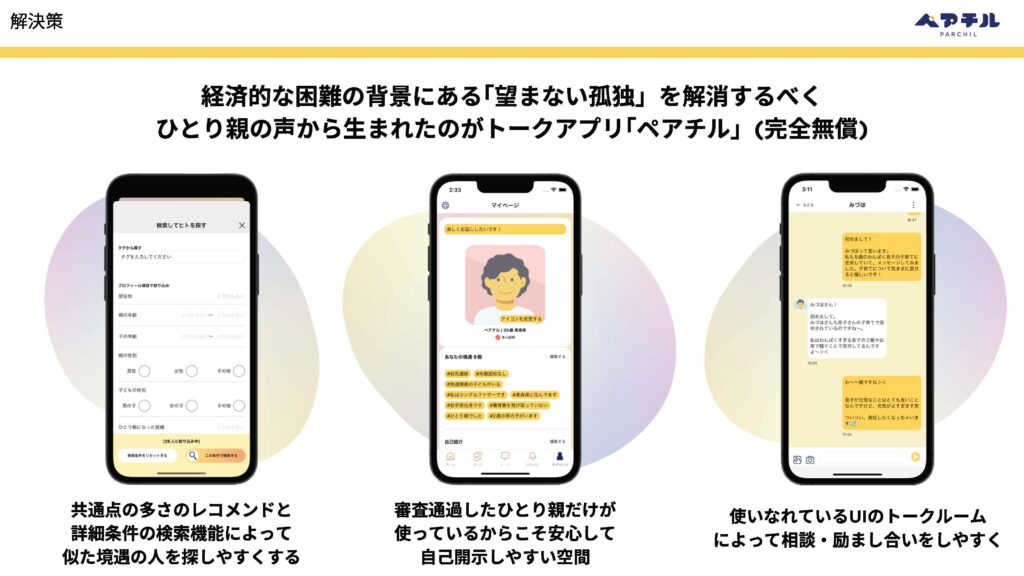 「ひとり親家庭の親子が絶対的幸福になれる社会の実現」を掲げ、国内最大級のひとり親限定トークアプリ『ペアチル』を運営 。生成AIやデータ活用による孤独・情報格差の解消に加え、当事者の声を基にした政策提言や自治体連携を通じ、親子を社会全体で支えるインフラ構築を推進する 。
