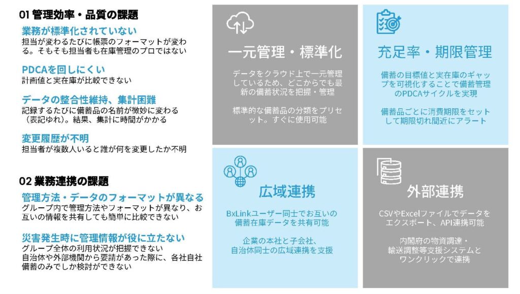 同社が提供する防災備蓄管理システム「BxLink®」は、属人的になりがちな備蓄管理をデータで「見える化」し、標準化することで、平時の業務効率化と有事の迅速な対応を両立させ、自治体・民間企業・地域住民が連携する「共助」の仕組みをシステムを通じて構築し、社会全体のレジリエンス向上に貢献。